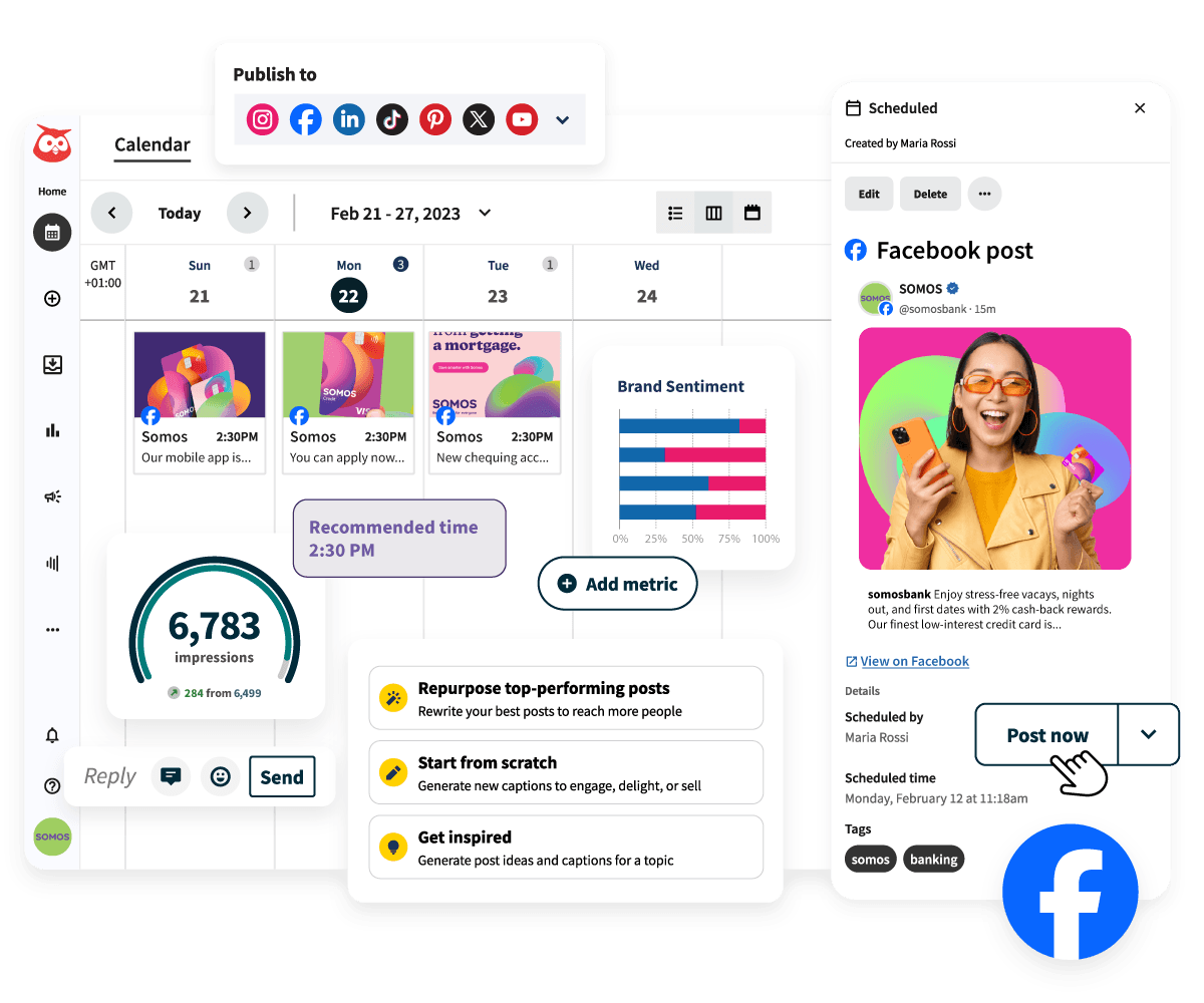 Post, schedule, and track your Facebook ads from the Hootsuite dashboard. Get more from your top posts and save hours each week by automatically turning them into paid ads. Plus, get winning ad variations in seconds with OwlyWriter AI.
